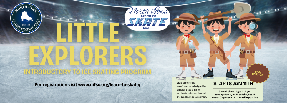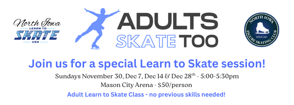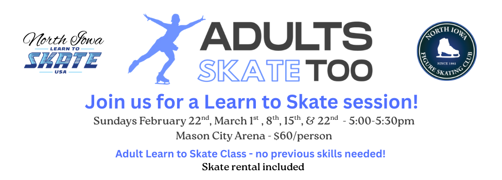North Iowa Figure Skating Club offers skating lessons to ALL of North Iowa! With classes through our Learn to Skate program available starting at age 2 and continuing through adulthood, as well as additional opportunities through our regular club memberships, you can advance your skills. CLICK HERE to learn more about your skating journey!